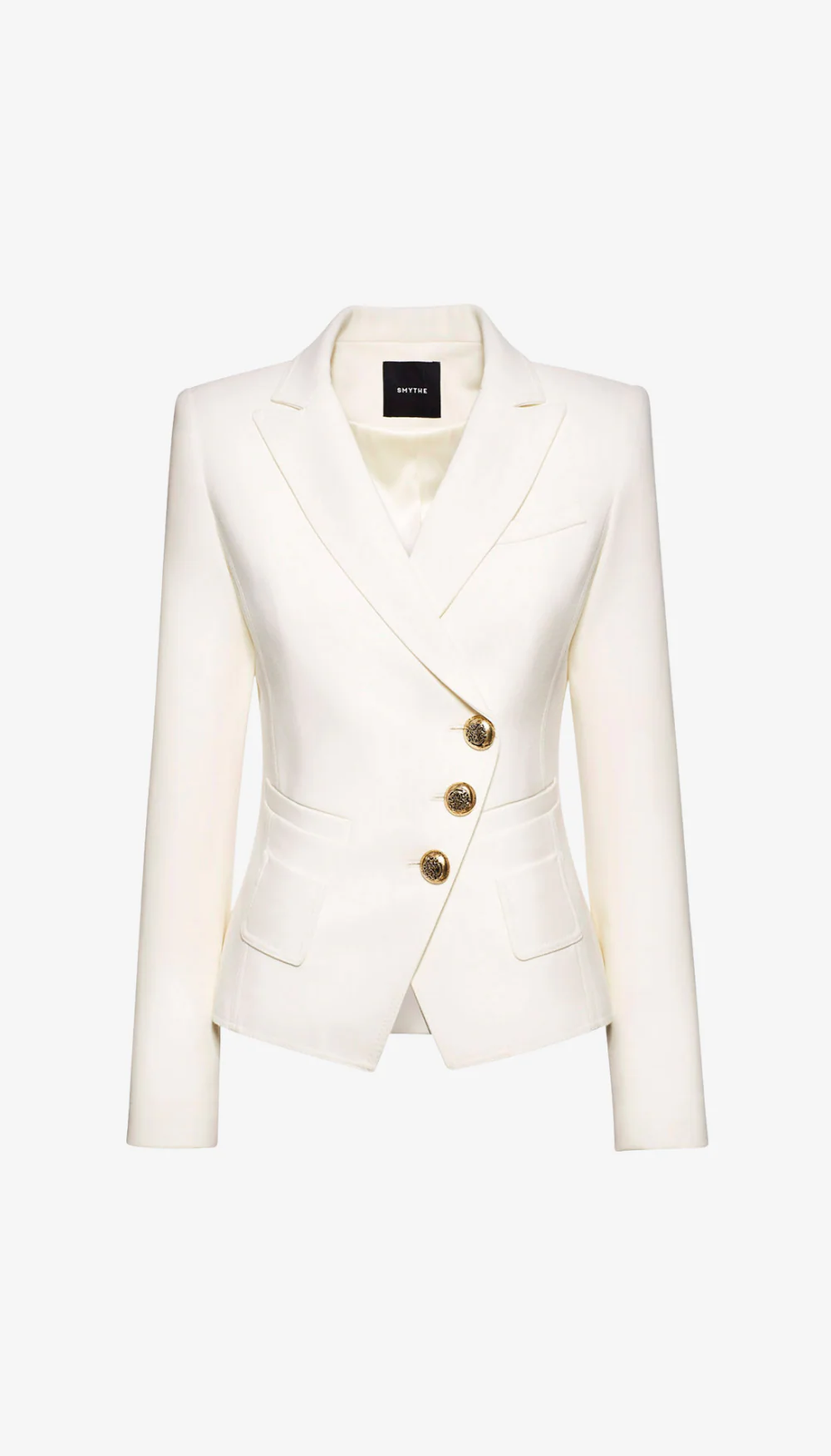 Details: Decidedly tailored, this best-selling stretch silhouette has an asymmetrical double-breasted closure featuring oversized brass hardware.